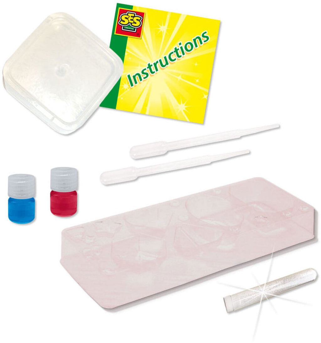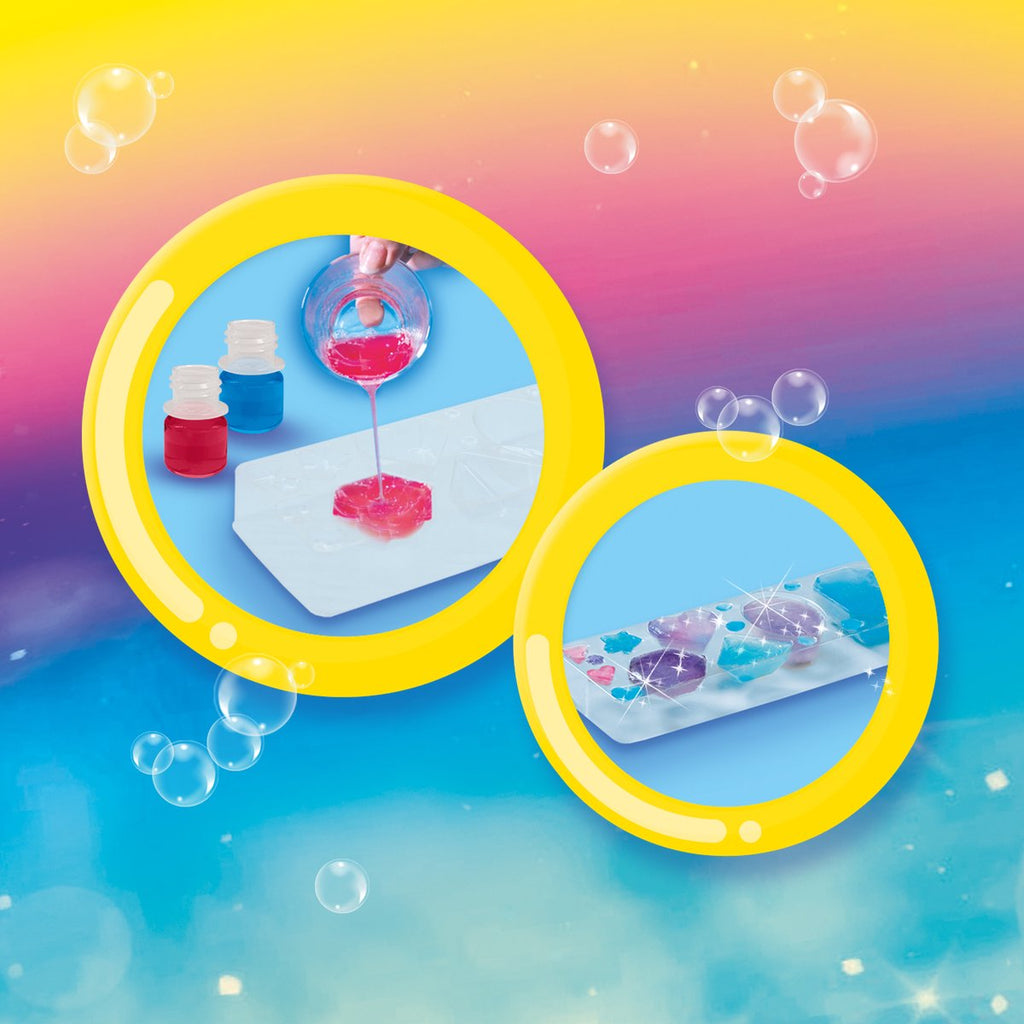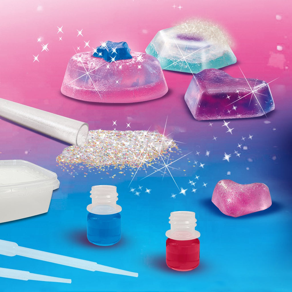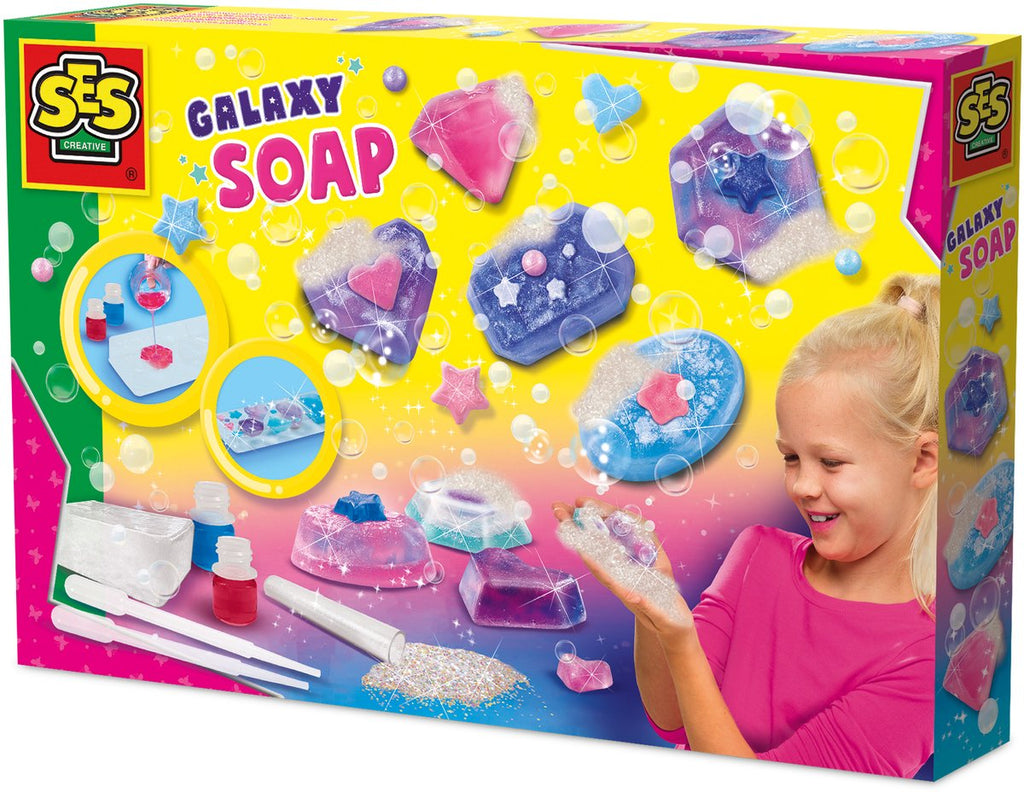 ¿Preparar tu propio jabón? ¡Qué genial! Con el set para hacer jabón Galaxy de SES Creative, puedes crear hermosos jabones de diferentes formas y colores, con un mágico efecto galáctico. Derrite el jabón, mezcla el colorante alimentario, añade purpurina y vierte todo en el molde. Perfecto para niños creativos a partir de 7 años que disfrutan creando algo único para usar o regalar.