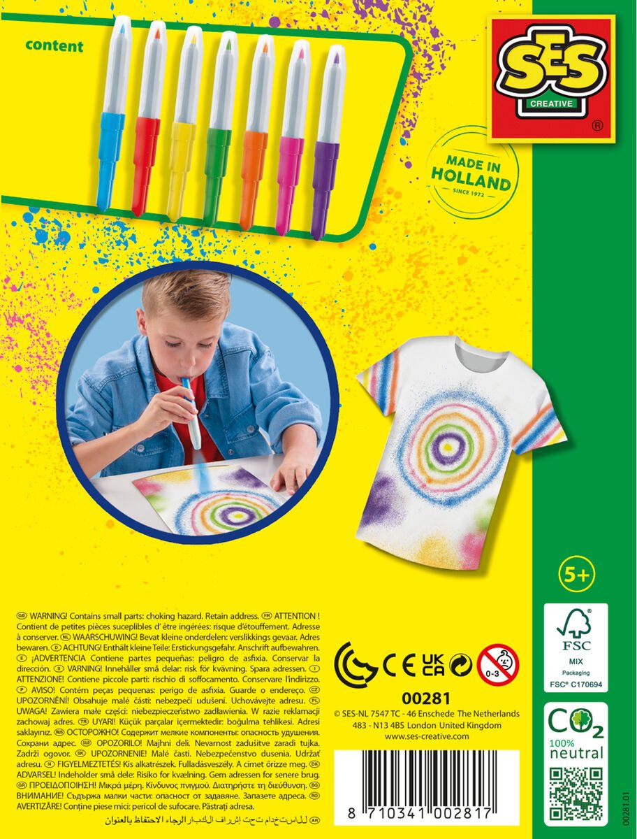 Con estos rotuladores, ¡ahora puedes personalizar tus prendas! Estos rotuladores especiales para tela hacen que decorar camisetas, bolsos y otras telas con diseños preciosos sea fácil y divertido. Sopla a través de los rotuladores y crea transiciones de color y patrones únicos. ¡Perfecto para niños que aman la moda y la creatividad!