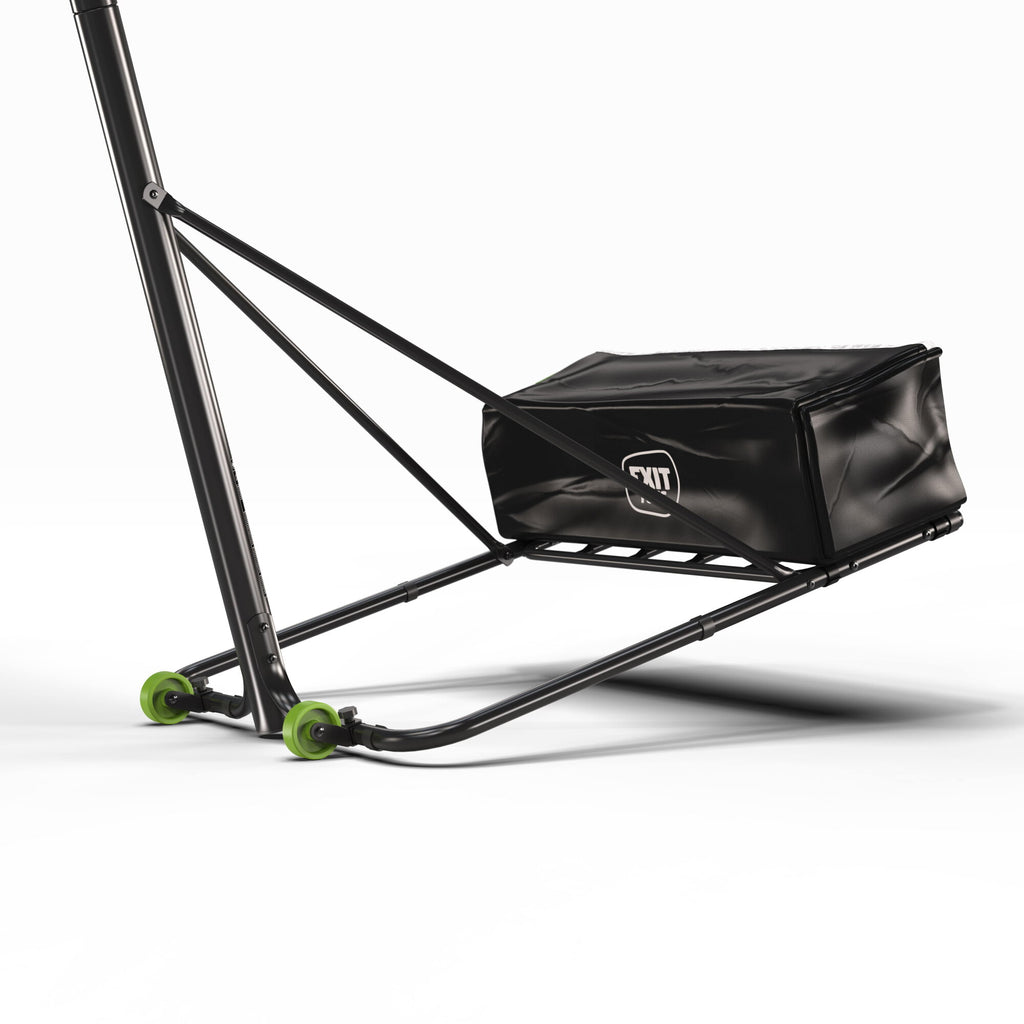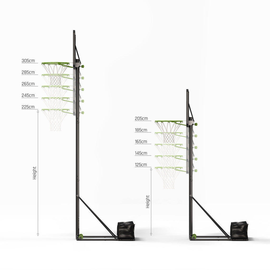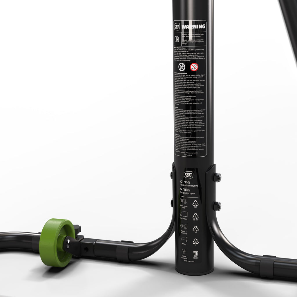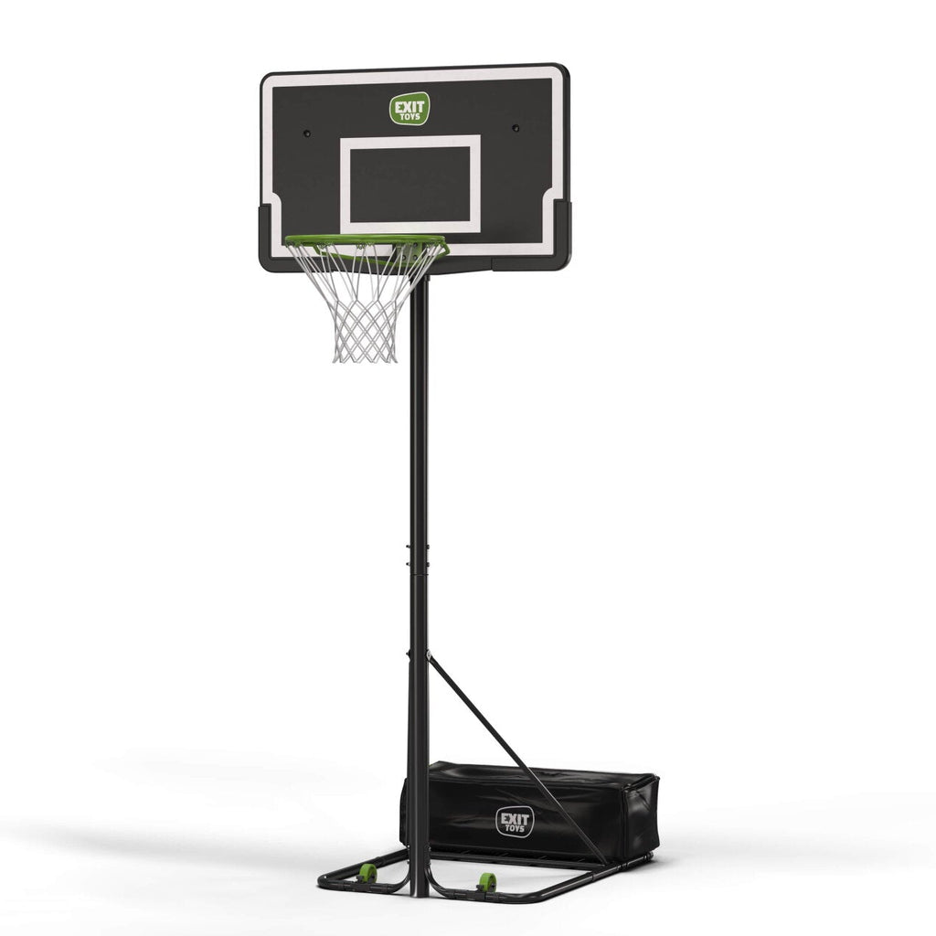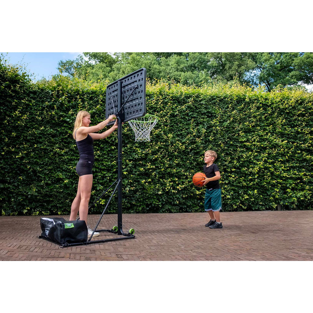 La EXIT NovaStar convierte cualquier espacio —el patio, la entrada o el jardín— en una cancha de básquet. Su sistema de altura ajustable permite elegir entre 10 posiciones distintas: cinco para niños (de 125 a 205 cm) y cinco para adultos (de 225 a 305 cm), alcanzando la altura oficial de torneo.