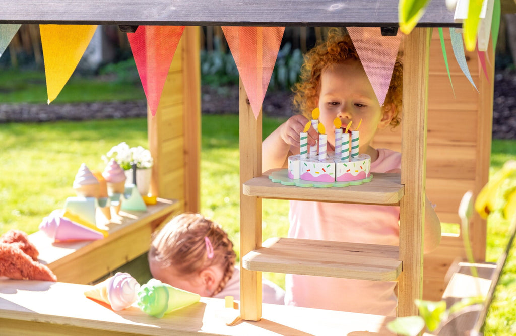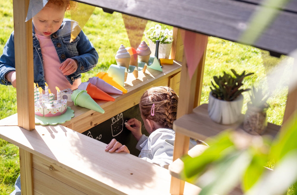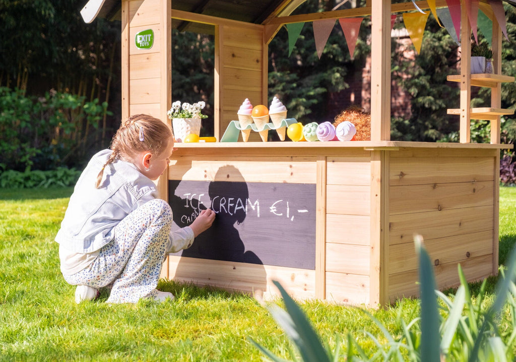 El diseño abierto permite jugar tanto dentro como fuera, fomentando el juego compartido y la interacción. Los detalles como el buzón, el mostrador y las repisas con pintura de pizarra hacen que todo parezca real.
